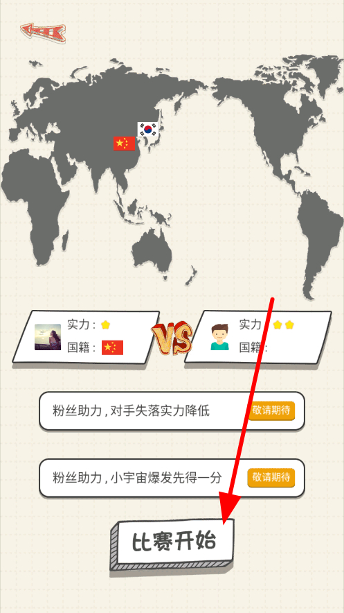 1、準(zhǔn)備階段看到不同國(guó)籍的對(duì)手,還能借助粉絲助力效果,如降低對(duì)手實(shí)力等,然后點(diǎn)擊比賽開始進(jìn)入對(duì)戰(zhàn)。