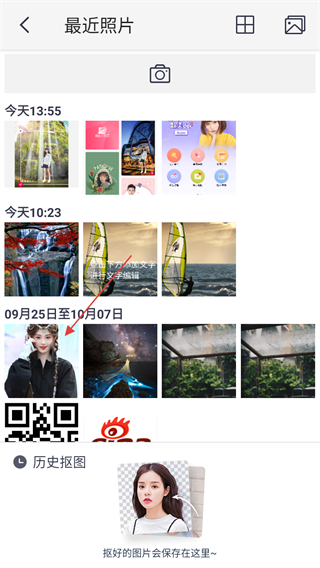 4、在最近照片選擇頁(yè)面,選擇要摳圖的照片,進(jìn)入摳圖編輯頁(yè)面。