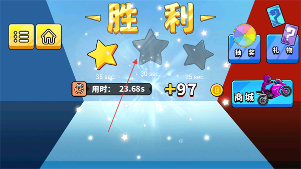 4、到達(dá)終點(diǎn)后,依據(jù)用時獲得星級評價,可點(diǎn)擊界面繼續(xù)挑戰(zhàn)新關(guān)卡。
