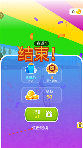 4、到達終點后,查看排名、超車數(shù)量和獎勵,點擊點擊繼續(xù)進入下一場景。