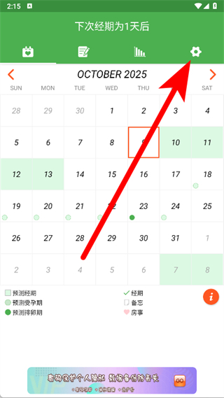 1、打開月經(jīng)期記錄APP,點擊頁面右上角的設(shè)置圖標(biāo)。