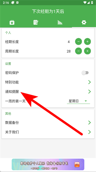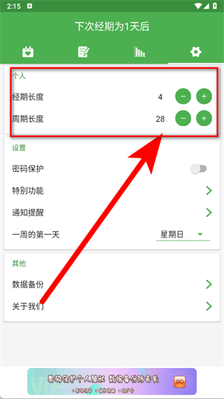 2、在設(shè)置頁面,調(diào)整經(jīng)期長度和周期長度的數(shù)值。