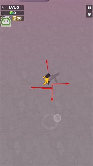 1、玩家操控角色在場(chǎng)景中移動(dòng),角色可向多個(gè)方向行動(dòng),初始有一定的時(shí)間限制和生命值顯示。