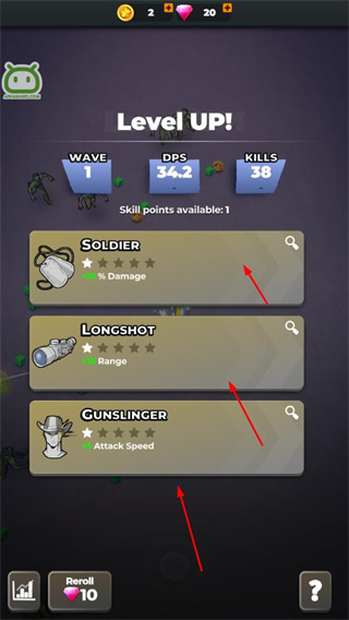 3、隨著擊殺喪尸,玩家會(huì)獲得經(jīng)驗(yàn),會(huì)出現(xiàn)技能選擇界面,可選擇不同的技能來增強(qiáng)角色能力,如Soldier、Longshot、Gunslinger,每次升級(jí)有1個(gè)技能點(diǎn)可供分配。