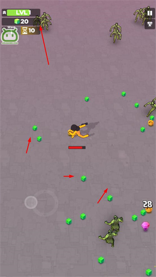2、在場(chǎng)景中會(huì)出現(xiàn)大量喪尸,玩家需要使用武器射擊喪尸,阻止其靠近,射擊過程中,會(huì)有傷害數(shù)值顯示,同時(shí)場(chǎng)景中會(huì)掉落綠色方塊等道具,可能是資源或增益物品。