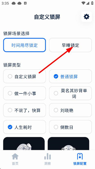 2、在自定義鎖屏頁面,鎖屏場景選擇可點擊早睡鎖定。