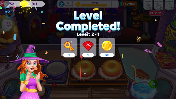 4、完成本關(guān)卡所有訂單,出現(xiàn)LevelCompleted!提示后,領(lǐng)取鑰匙,鉆石,金幣等通關(guān)獎勵,進入下一關(guān)。