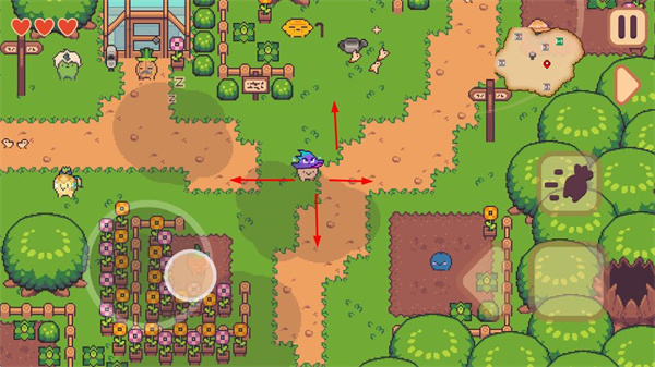 1、在游戲場(chǎng)景中,可操控角色在不同區(qū)域移動(dòng),探索包含農(nóng)田、樹林等的地圖,發(fā)現(xiàn)各種場(chǎng)景與元素。