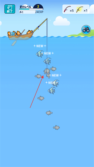 3、魚上鉤后,松開按鈕收線,釣到不同種類的魚,提升釣魚等級(jí)。