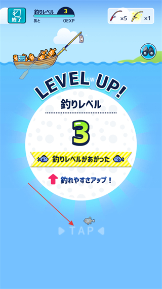 4、當(dāng)出現(xiàn)LEVELUP!提示,等級(jí)提升如到3級(jí),點(diǎn)擊TAP繼續(xù)游戲,重復(fù)釣魚等操作,收集更多魚類來通關(guān)。