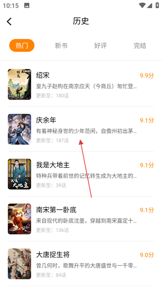 3、在歷史類漫畫列表頁面,找到慶余年,點(diǎn)擊進(jìn)入其詳情頁面。