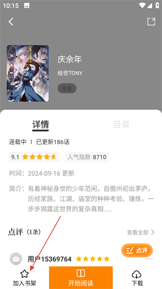 4、在慶余年詳情頁面,點(diǎn)擊加入書架,可將其添加到書架。