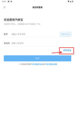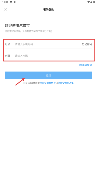 4、在密碼登錄頁面,輸入手機(jī)號(hào)碼和密碼后勾選已閱讀并同意汽修寶服務(wù)協(xié)議和汽修寶隱私政策,完成賬號(hào)登錄操作。