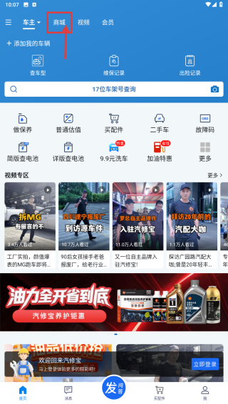 1、打開汽車服務(wù)類應(yīng)用,點(diǎn)擊頂部商城選項(xiàng),進(jìn)入配件商城頁面。