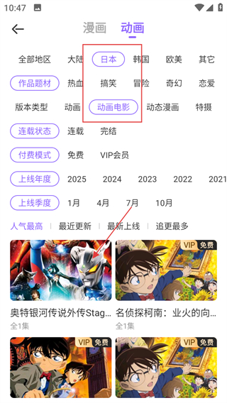 2、在分類篩選頁面,選擇日本、動畫電影篩選條件,找到目標電影。