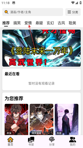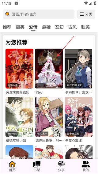 1、進入軟件首頁,點擊愛情分類標(biāo)簽,切換到愛情類漫畫推薦頁面。