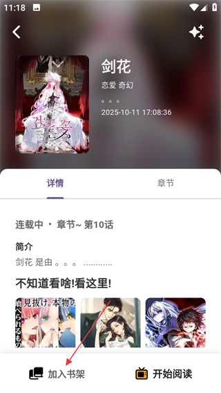 3、在劍花詳情頁面,點擊加入書架,可將其添加到書架方便后續(xù)閱讀。