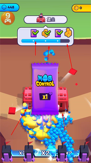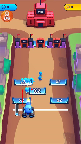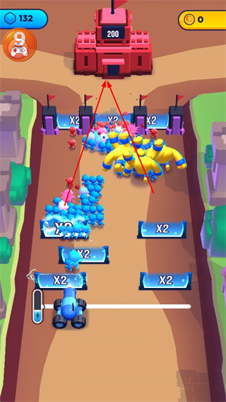2、在關(guān)卡中,利用X2等倍數(shù)裝置,讓藍色小人數(shù)量倍增,壯大隊伍規(guī)模,為進攻助力。