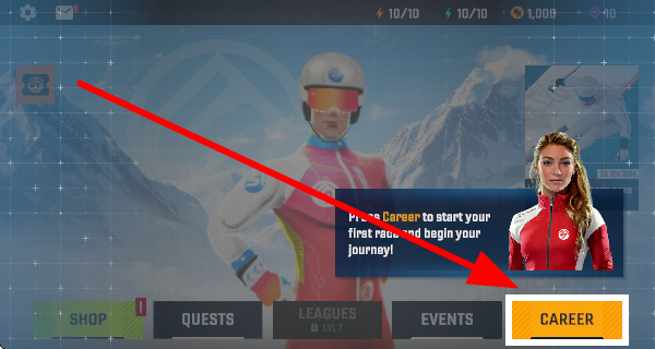 1、玩家初次體驗(yàn)點(diǎn)擊CAREER按鈕,開啟滑雪生涯,開始第一場滑雪比賽,踏上滑雪冒險之旅。