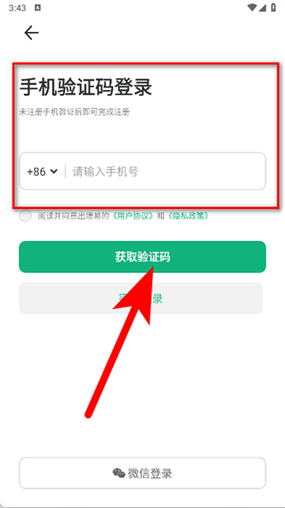 3、在手機(jī)驗(yàn)證碼登錄頁面,輸入手機(jī)號(hào)后,點(diǎn)擊獲取驗(yàn)證碼。