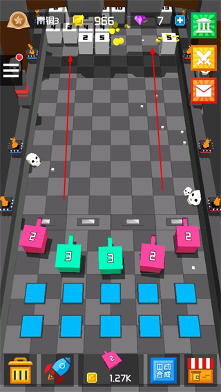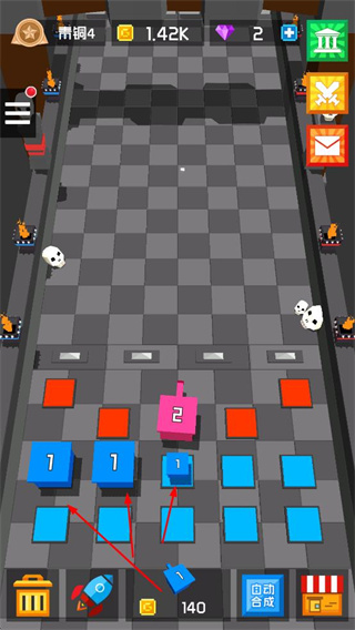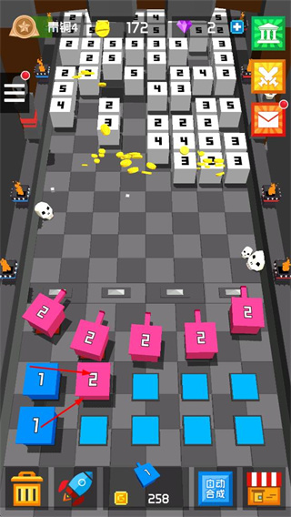 2、合成的方塊會(huì)自動(dòng)攻擊前方的數(shù)字方塊,消滅它們獲取金幣。