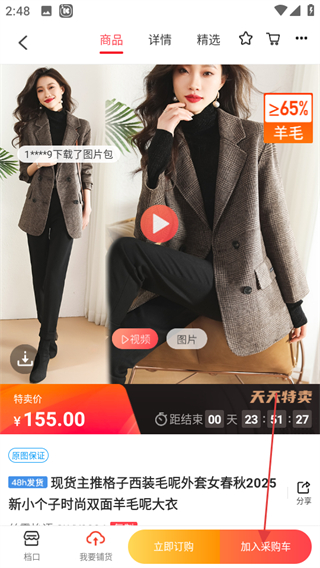 4、在商品詳情頁,點擊加入采購車,將商品加入采購車。