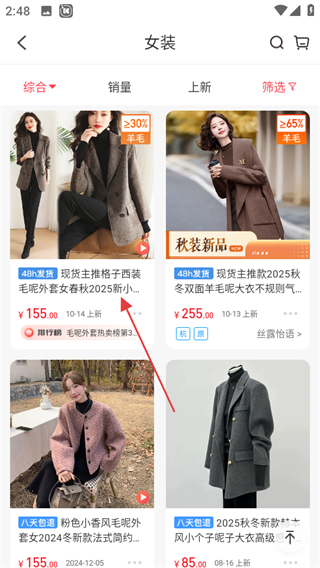 3、在毛呢外套商品列表頁面,選擇想要的商品,進入商品詳情頁。