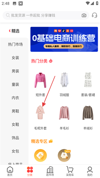 2、在分類頁面,選擇毛呢外套,進入毛呢外套商品列表頁面。