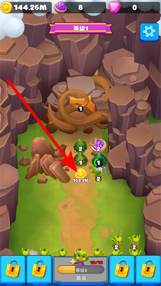 2、點(diǎn)擊畫面中顯示的金幣標(biāo)識(shí)位置,派遣哥布林前往挖掘,獲取金幣,金幣可用于后續(xù)培養(yǎng)哥布林等操作。
