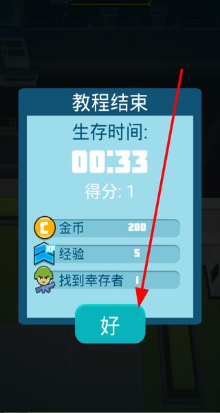 4、成功完成救援等任務(wù)后,會(huì)顯示教程結(jié)束界面,查看生存時(shí)間、得分等信息,點(diǎn)擊好繼續(xù)游戲。
