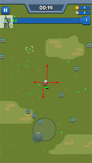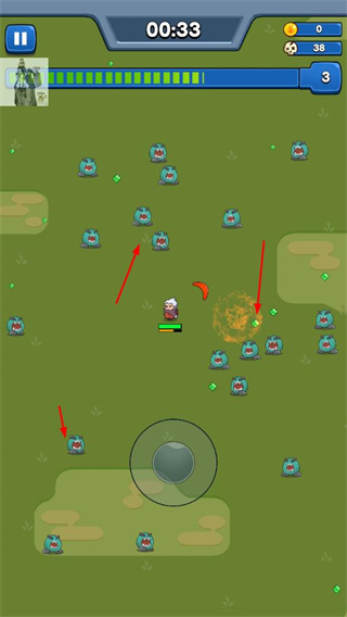 1、操控角色在地圖中移動(dòng),收集綠色晶體資源,同時(shí)攻擊藍(lán)色怪物,提升等級(jí)。