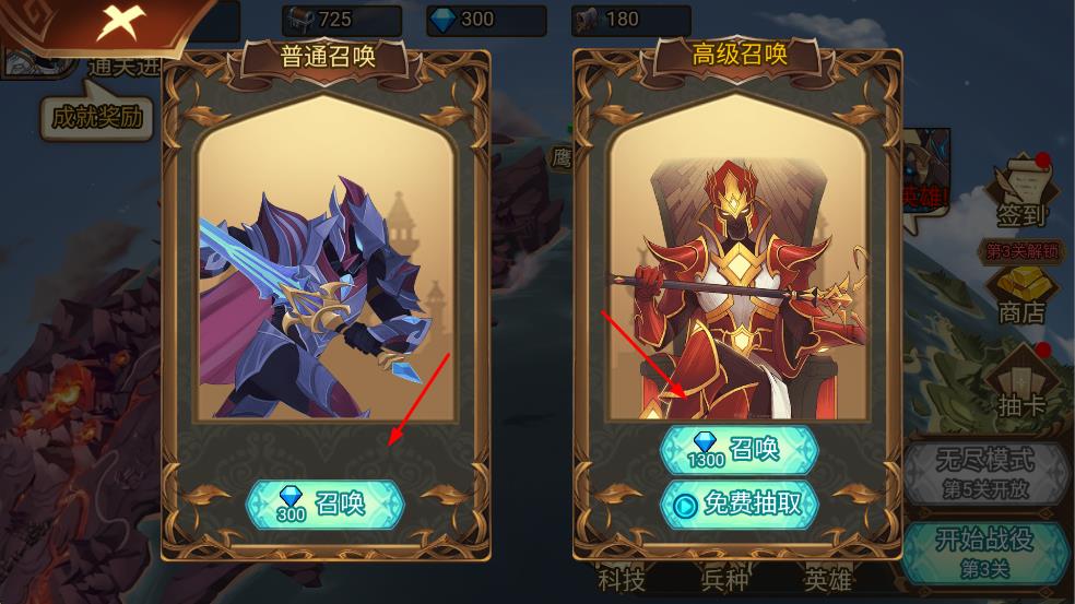 1、通過(guò)普通召喚和高級(jí)召喚獲取英雄,擴(kuò)充戰(zhàn)力陣容。