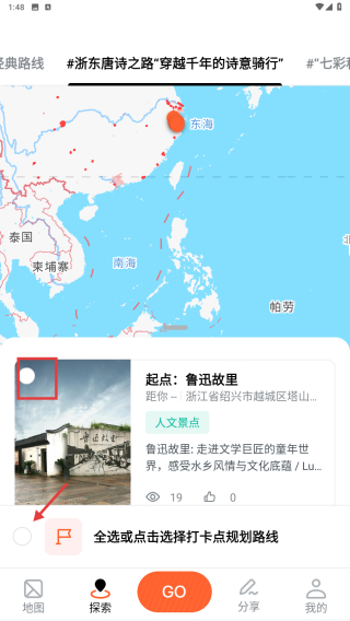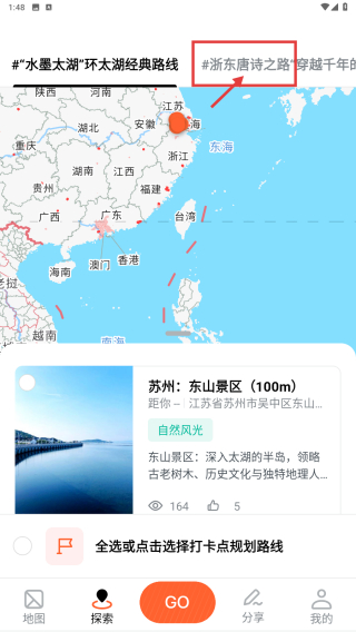 2、在探索頁面,選擇浙東唐詩之路路線標簽,查看該路線的打卡點。