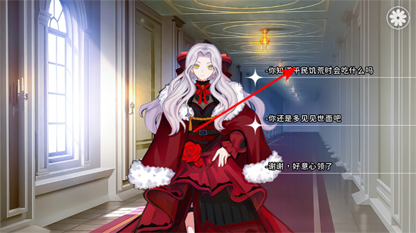 2、選擇對話選項(xiàng),在與紅衣角色的對話中,選擇你知道平民饑荒時會吃什么嗎選項(xiàng),開啟該對話分支,影響劇情走向和角色互動。