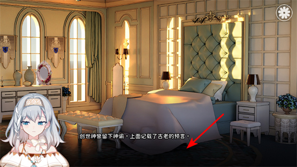 3、探索場景信息,在臥室場景中,點(diǎn)擊劇情推進(jìn)區(qū)域,閱讀關(guān)于創(chuàng)世神留下神諭的劇情內(nèi)容,獲取世界觀相關(guān)關(guān)鍵信息,推進(jìn)進(jìn)程。