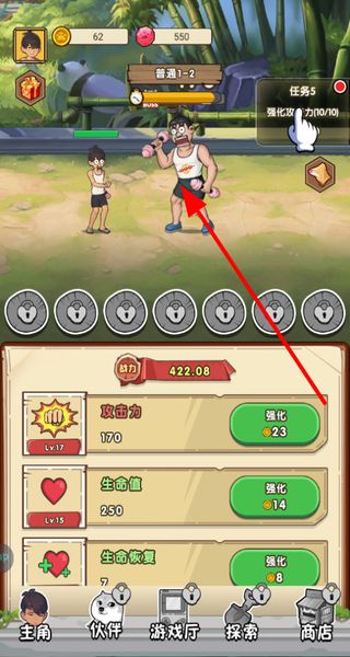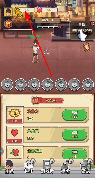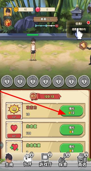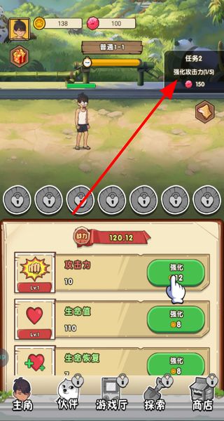 1、消耗金幣強(qiáng)化攻擊力,提升角色攻擊能力,助力戰(zhàn)斗,強(qiáng)化所需金幣數(shù)量會(huì)有提示。