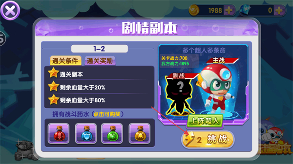 1、在劇情副本界面選1-2關(guān)卡查看通關(guān)條件與通關(guān)獎(jiǎng)勵(lì)點(diǎn)擊上陣超人再點(diǎn)挑戰(zhàn)。
