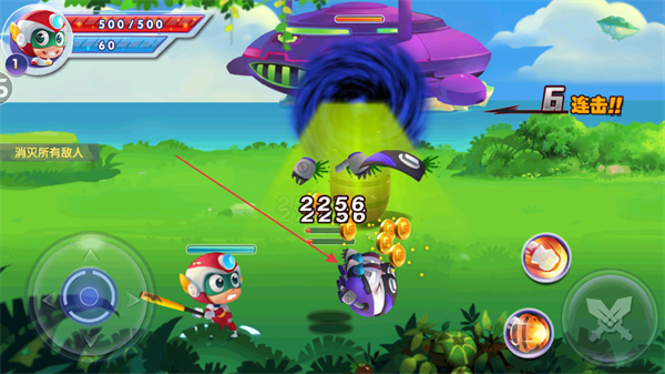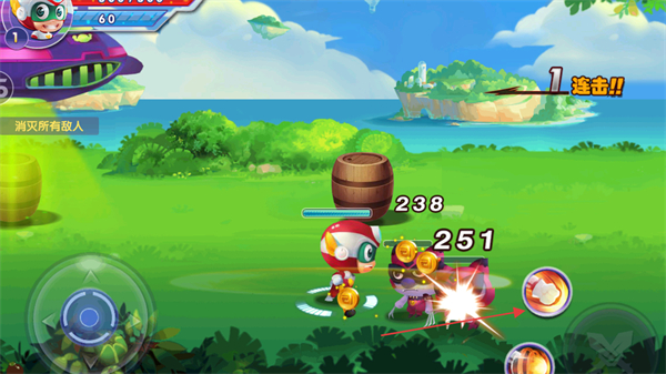 2、進(jìn)入戰(zhàn)斗用左下方虛擬搖桿控制開(kāi)心超人移動(dòng)點(diǎn)擊攻擊按鈕打怪積攢連擊數(shù)。