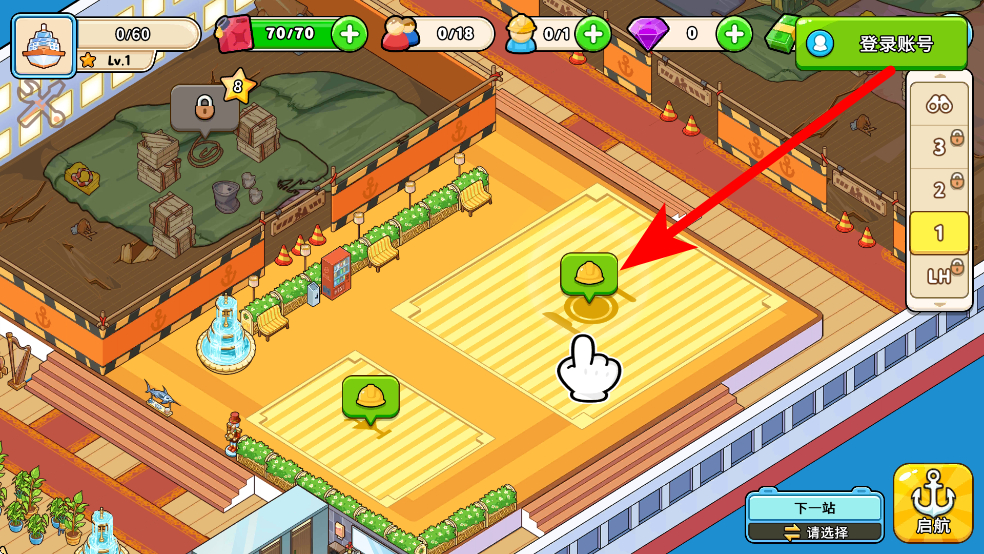1、進(jìn)入游戲后,先點(diǎn)擊帶有建造標(biāo)識(shí)的區(qū)域,會(huì)彈出可建造設(shè)施的選擇界面,比如選擇建造餐廳,確認(rèn)后消耗相應(yīng)的金幣、人力等資源,等待建造時(shí)間結(jié)束,餐廳就會(huì)搭建完成。