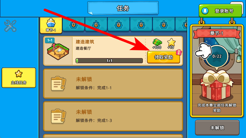 4、任務(wù)完成后,在任務(wù)界面找到對(duì)應(yīng)任務(wù),點(diǎn)擊領(lǐng)取獎(jiǎng)勵(lì)按鈕,就能獲得相應(yīng)獎(jiǎng)勵(lì),如1-1任務(wù)完成可領(lǐng)取100金幣和10星星,這些獎(jiǎng)勵(lì)可用于后續(xù)游輪建設(shè)。