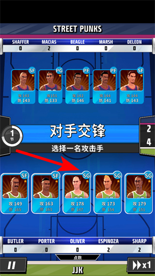 3、在對手交鋒界面,選擇一名攻擊手,可發(fā)起進攻,利用攻擊手的屬性優(yōu)勢爭取得分。