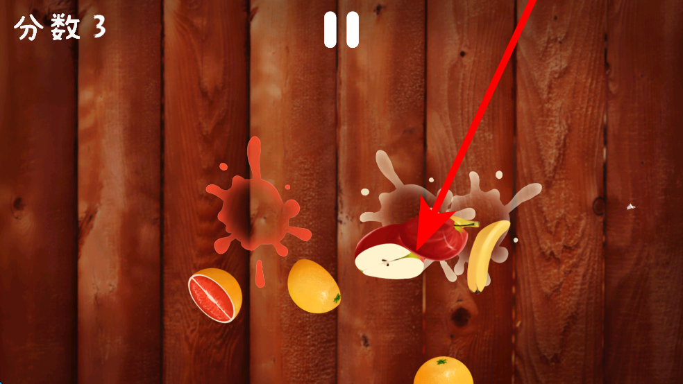 3、通過滑動(dòng)屏幕切割出現(xiàn)的水果,成功切割可獲得分?jǐn)?shù),分?jǐn)?shù)會(huì)實(shí)時(shí)顯示在左上角,切割不同水果得分不同,盡可能多切割水果積累高分。