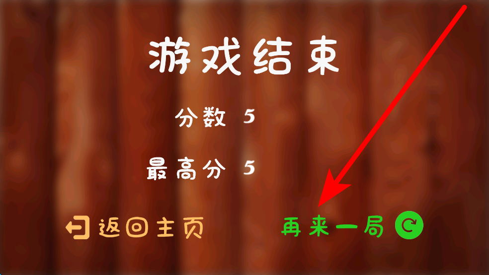 4、游戲結(jié)束后會(huì)顯示最終分?jǐn)?shù)與最高分,若想繼續(xù)挑戰(zhàn)可點(diǎn)擊再來一局,若想退出可選擇返回主頁,方便玩家根據(jù)需求選擇后續(xù)操作。