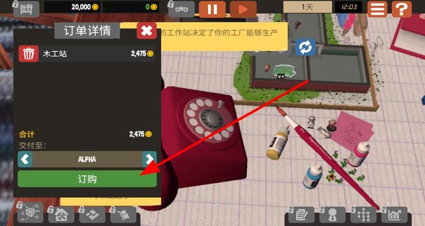 1、在訂單詳情界面點擊訂購,采購木工站等生產(chǎn)設(shè)備,擴展工廠的生產(chǎn)能力,推動業(yè)務(wù)發(fā)展。