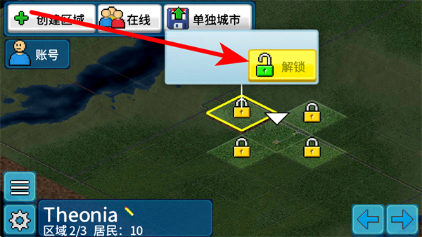 1、進入游戲后,若區(qū)域處于鎖定狀態(tài),需滿足一定條件后點擊解鎖按鈕,解鎖新區(qū)域,以便拓展城市建造空間。