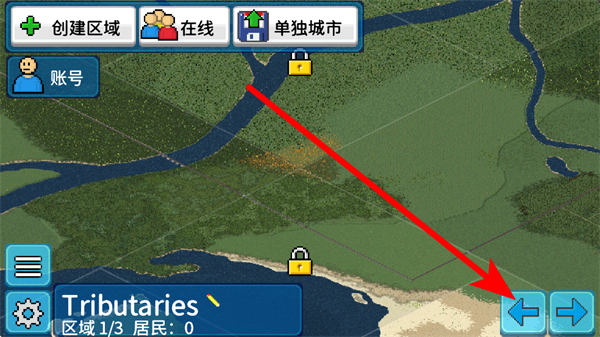 2、在區(qū)域選擇界面,可通過左右箭頭切換區(qū)域,找到帶有新建城市提示的地塊,點擊該按鈕進入創(chuàng)建流程。