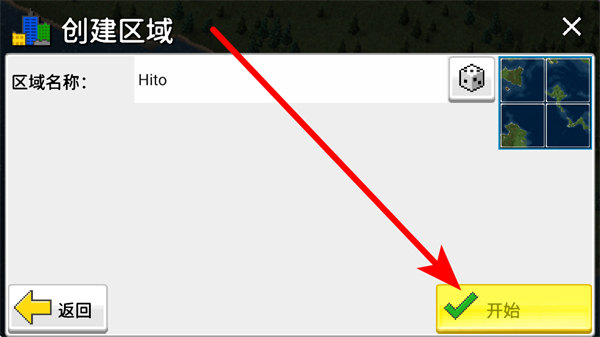 3、在創(chuàng)建區(qū)域界面,可設(shè)置區(qū)域名稱,也可點擊骰子圖標(biāo)更換地形,確認后點擊開始按鈕,完成區(qū)域創(chuàng)建。