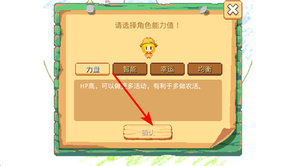 1、選擇角色能力值如力量、智能等后,點(diǎn)擊確認(rèn)按鈕,確定角色屬性,開(kāi)啟農(nóng)場(chǎng)經(jīng)營(yíng)。