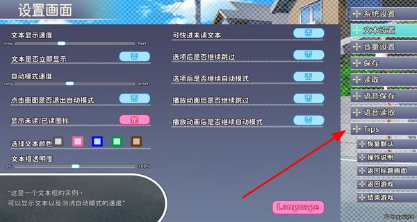 4、在設(shè)置界面可調(diào)整文本顯示速度、字體顏色等參數(shù),根據(jù)個(gè)人使用習(xí)慣優(yōu)化游戲體驗(yàn),更順暢地進(jìn)行冒險(xiǎn)。