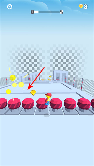 2、在障礙收集環(huán)節(jié),操控角色在紅色圓柱障礙上移動(dòng),通過點(diǎn)擊屏幕控制跳躍節(jié)奏,優(yōu)先收集黃色道具,同時(shí)留意網(wǎng)格背景與布局。